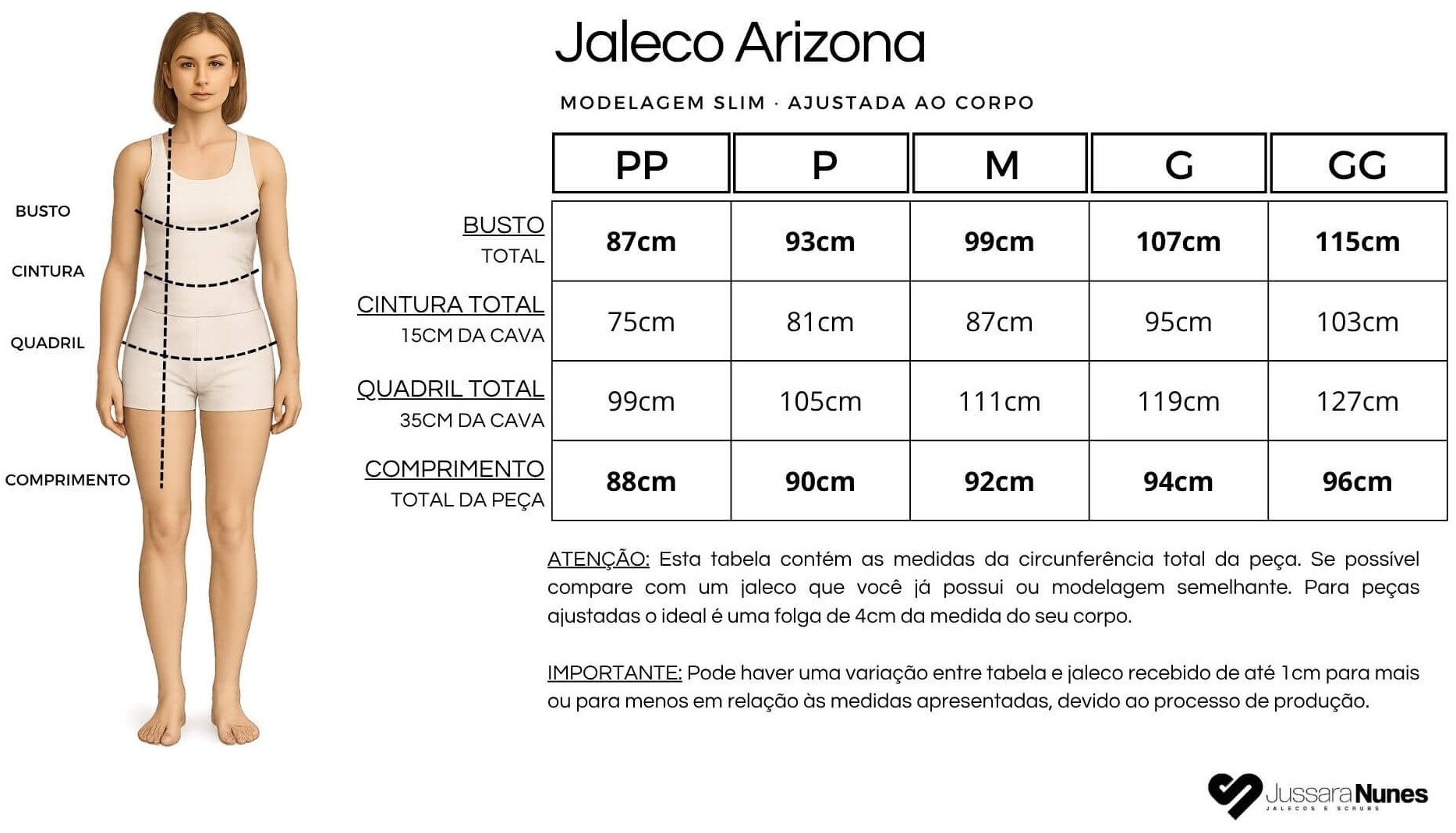 A modelagem slim garante um visual elegante sem perder conforto. Conta com gola padre, zíper frontal destacável, elástico nos punhos, recortes estratégicos que valorizam a silhueta e abertura nas costas para maior mobilidade. Além disso, o Jaleco Arizona está dentro das recomendações da norma ABNT NBR16264, sendo perfeito para estudantes e profissionais da saúde