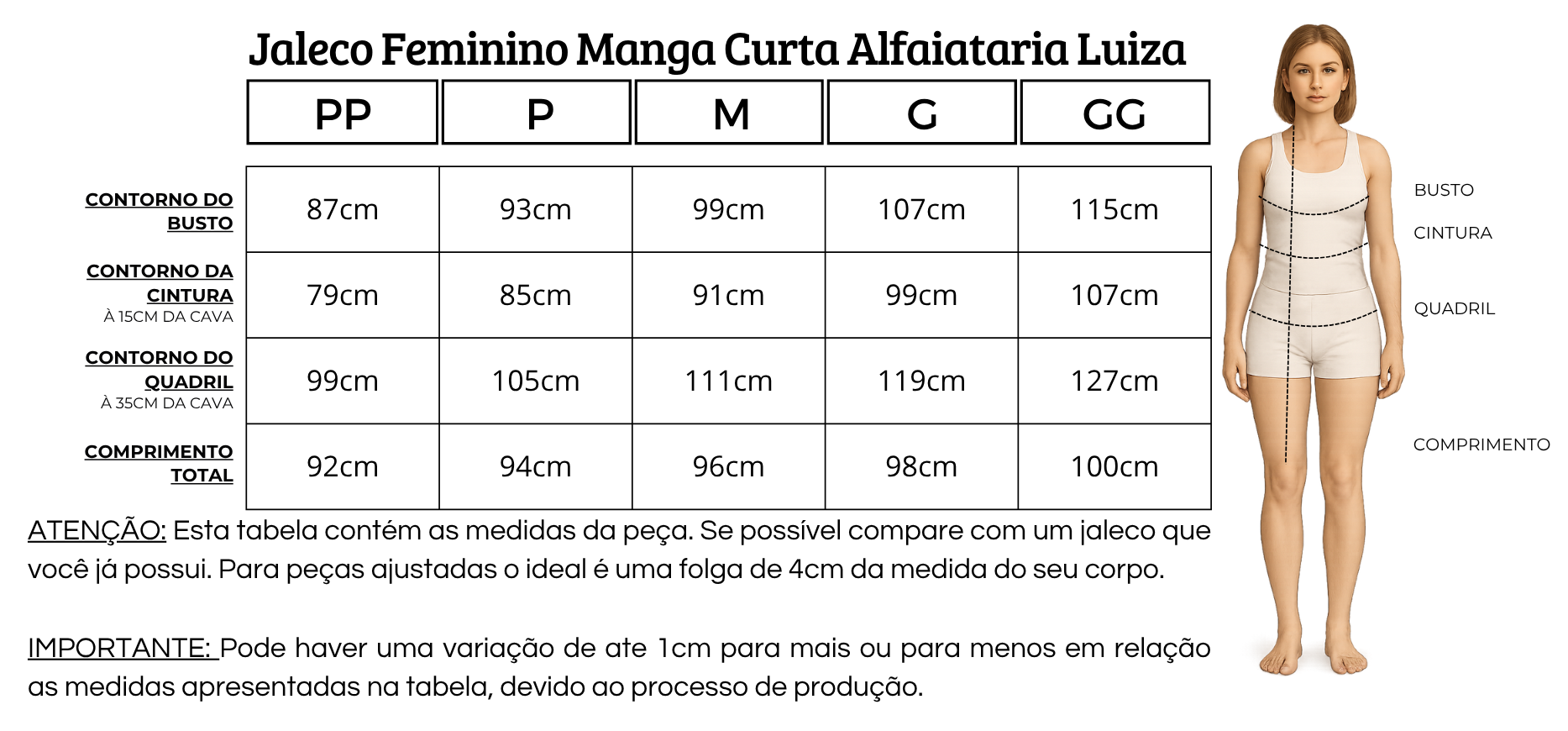 Dica Importante: O ideal é ter uma diferença de pelo menos 4 cm, porque o jaleco não pode ficar muito justo, pois pode atrapalhar na movimentação.