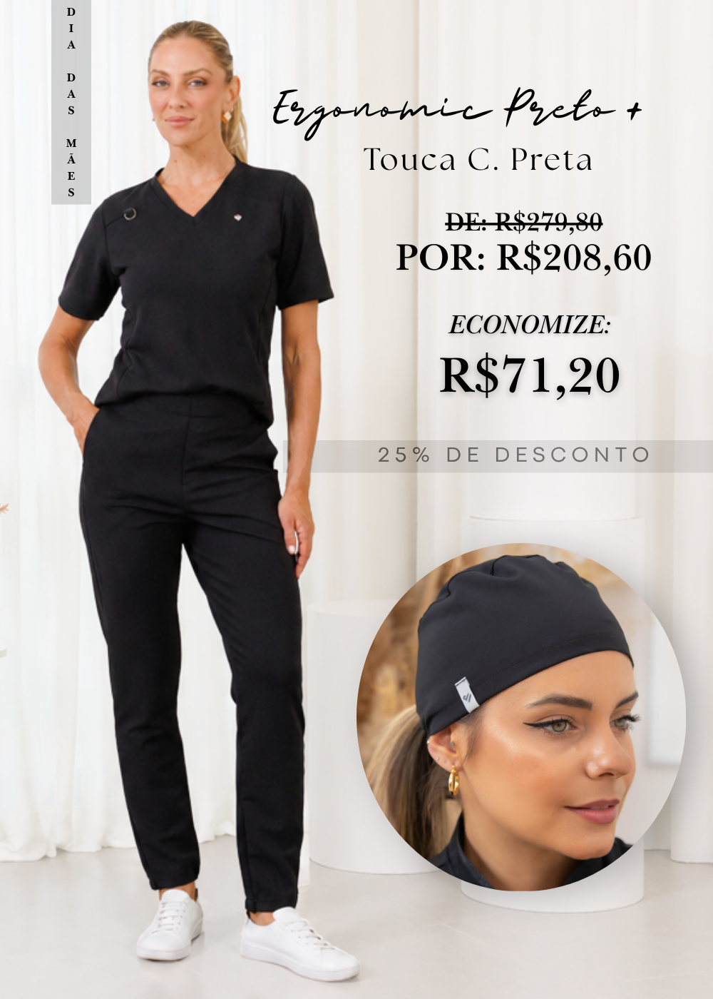 Combo Mãe Funcional: Scrub Ergonomic Preto + Touca Cirúrgica Preta