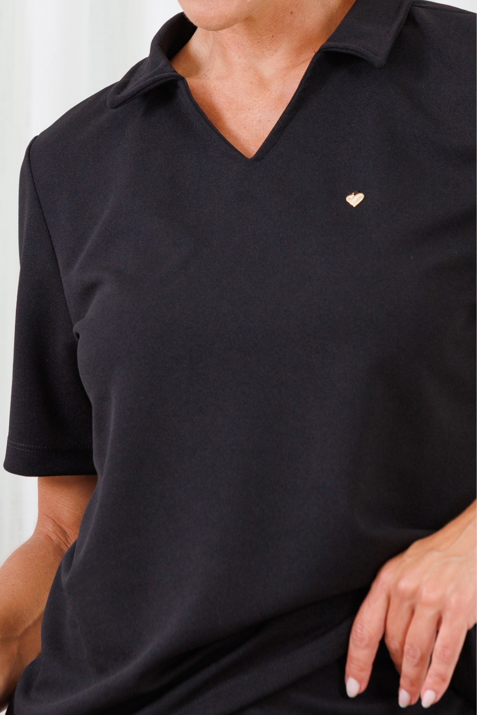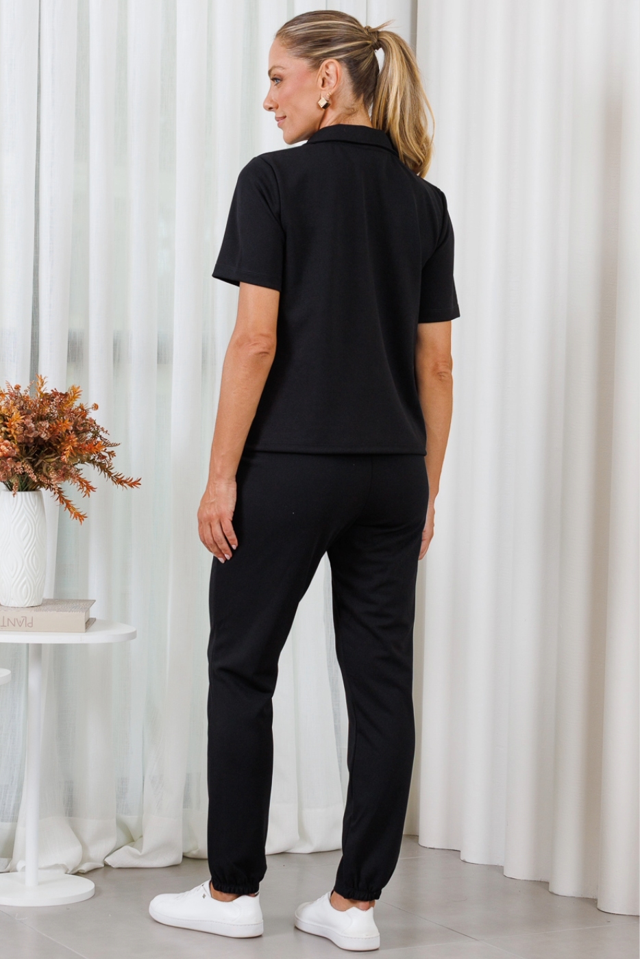A blusa apresenta modelagem moderna com gola polo estruturada e decote em “V”, trazendo um visual elegante e atual. As mangas curtas oferecem praticidade para o dia a dia, enquanto o caimento levemente solto proporciona conforto prolongado. O detalhe minimalista aplicado na parte frontal adiciona um toque delicado e sofisticado à peça. A calça possui modelagem reta, com caimento impecável que valoriza a silhueta de forma discreta e elegante. Conta com bolsos funcionais que unem praticidade e estilo, sendo perfeita para a rotina de profissionais que precisam de mobilidade e organização.