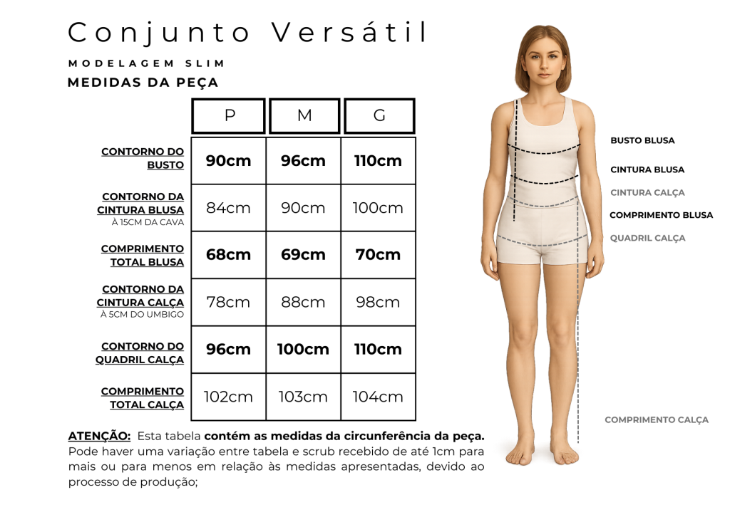 O Conjunto Scrub Versátil possui modelagem slim com recortes ergonômicos, desenvolvidos para acompanhar os movimentos do corpo com conforto e precisão. A blusa levemente alongada oferece segurança ao vestir, enquanto a calça reta e alongada valoriza a silhueta com elegância. Confeccionado em Gabardine 100% poliéster, o tecido apresenta toque macio, estrutura premium e excelente caimento, mantendo o visual alinhado ao longo do dia.