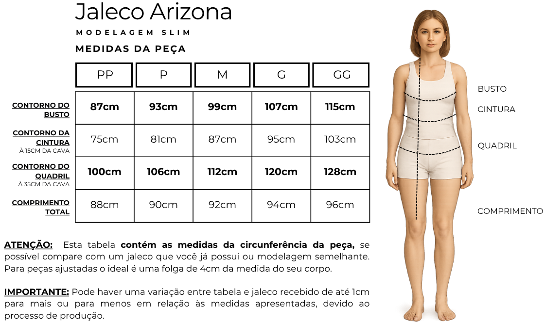 A modelagem slim garante um visual elegante sem perder conforto. Conta com gola padre, zíper frontal destacável, elástico nos punhos, recortes estratégicos que valorizam a silhueta e abertura nas costas para maior mobilidade. Além disso, o Jaleco Arizona está dentro das recomendações da norma ABNT NBR16264, sendo perfeito para estudantes e profissionais da saúde, além destes benefícios, este modelo permite personalização em bordado com nome, logo ou ambos. Um toque único para valorizar ainda mais sua presença profissional!