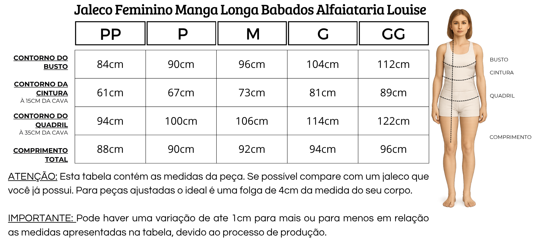 Nós, da Jussara Nunes Jalecos, queremos garantir a sua assertividade na escolha do tamanho ideal para você, para conferir suas medidas e escolher o seu jaleco ideal, confira o post no blog, feito para que você encontre a peça perfeita, também preparamos um vídeo especial pra você de como tirar as medidas