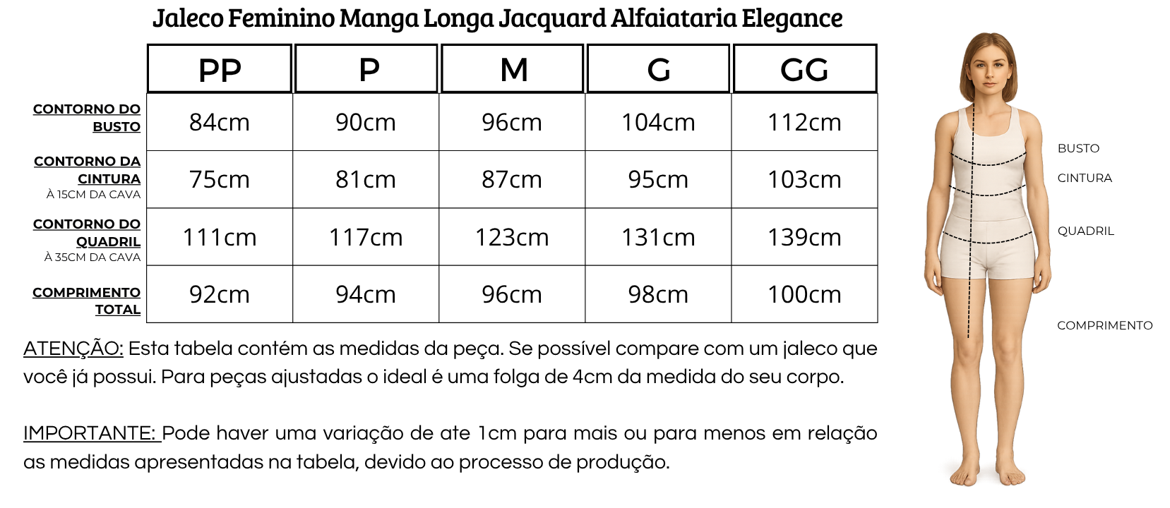 Nós, da Jussara Nunes Jalecos, queremos garantir a sua assertividade na escolha do tamanho ideal para você, para conferir suas medidas e escolher o seu jaleco ideal, confira o post no blog, feito para que você encontre a peça perfeita, também preparamos um vídeo especial para você de como tirar as medidas