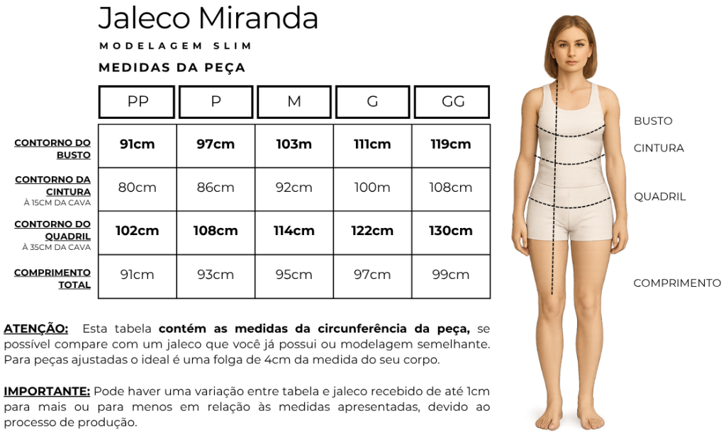 O Jaleco Miranda traduz elegância, feminilidade e presença profissional, seu corpo em Alfaiataria Ultra Span Commerce (90% poliéster e 10% elastano) garante um caimento impecável, valorizando a silhueta com conforto. O charme da peça está na gola laço e mangas em chiffon (100% poliéster) que são leves, delicadas e com toque de sofisticação, com fechamento em botões de massa, recortes estratégicos e bolsos funcionais, esse jaleco une desempenho com estilo refinado para profissionais que se destacam.