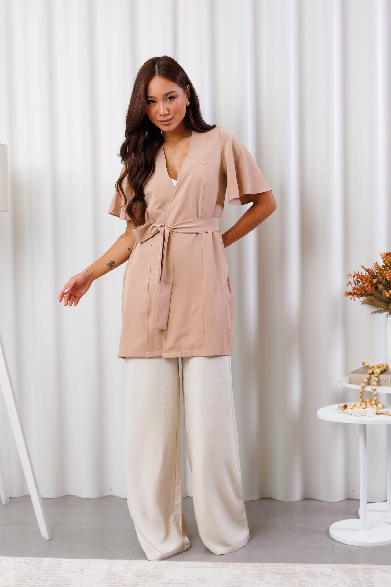 - Detalhes de movimento e estilo: mangas boca de sino, decote V e tranpassado com botão interno transparente, design moderno com segurança.